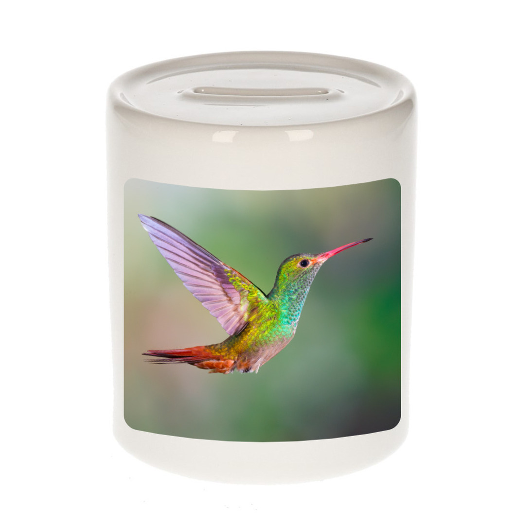 Dieren foto spaarpot kolibrie vogel wit 9 cm. Deze spaarpot is aan twee kanten bedrukt met een mooie kolibrie vogel foto. Een musthave voor een echte dieren/ vogels liefhebber of iemand die alles van vogels spaart. Erg leuk om cadeau te doen aan een echte vogel fan!