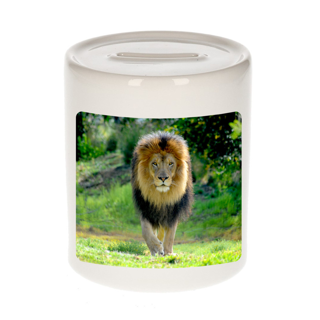 Dieren foto spaarpot leeuw wit 9 cm. Deze spaarpot is aan twee kanten bedrukt met een mooie leeuw foto. Een musthave voor een echte dieren/ leeuwen liefhebber of iemand die alles van leeuwen spaart. Erg leuk om cadeau te doen aan een echte leeuwen fan!