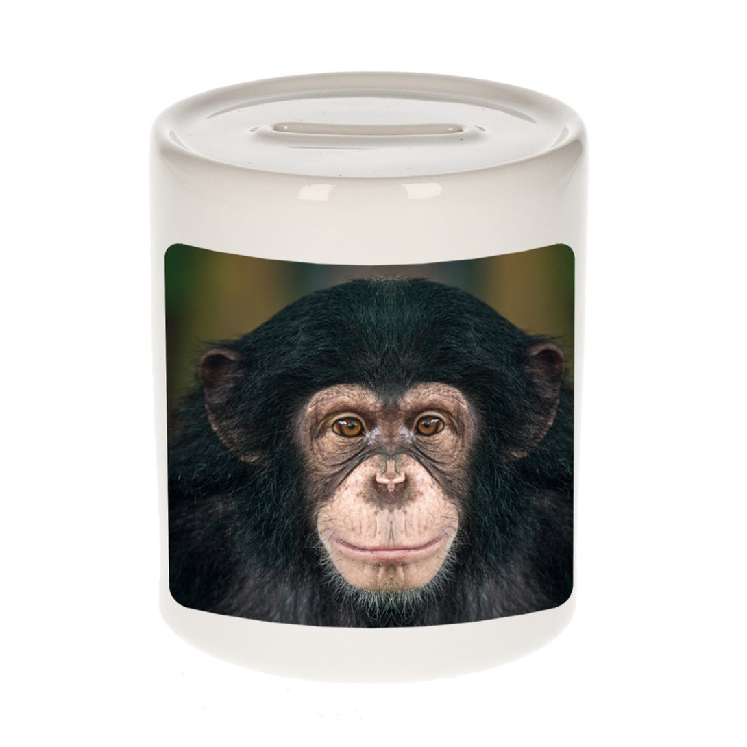 Dieren foto spaarpot leuke chimpansee wit 9 cm. Deze spaarpot is aan twee kanten bedrukt met een mooie leuke chimpansee foto. Een musthave voor een echte dieren/ apen liefhebber of iemand die alles van apen spaart. Erg leuk om cadeau te doen aan een echte apen fan!