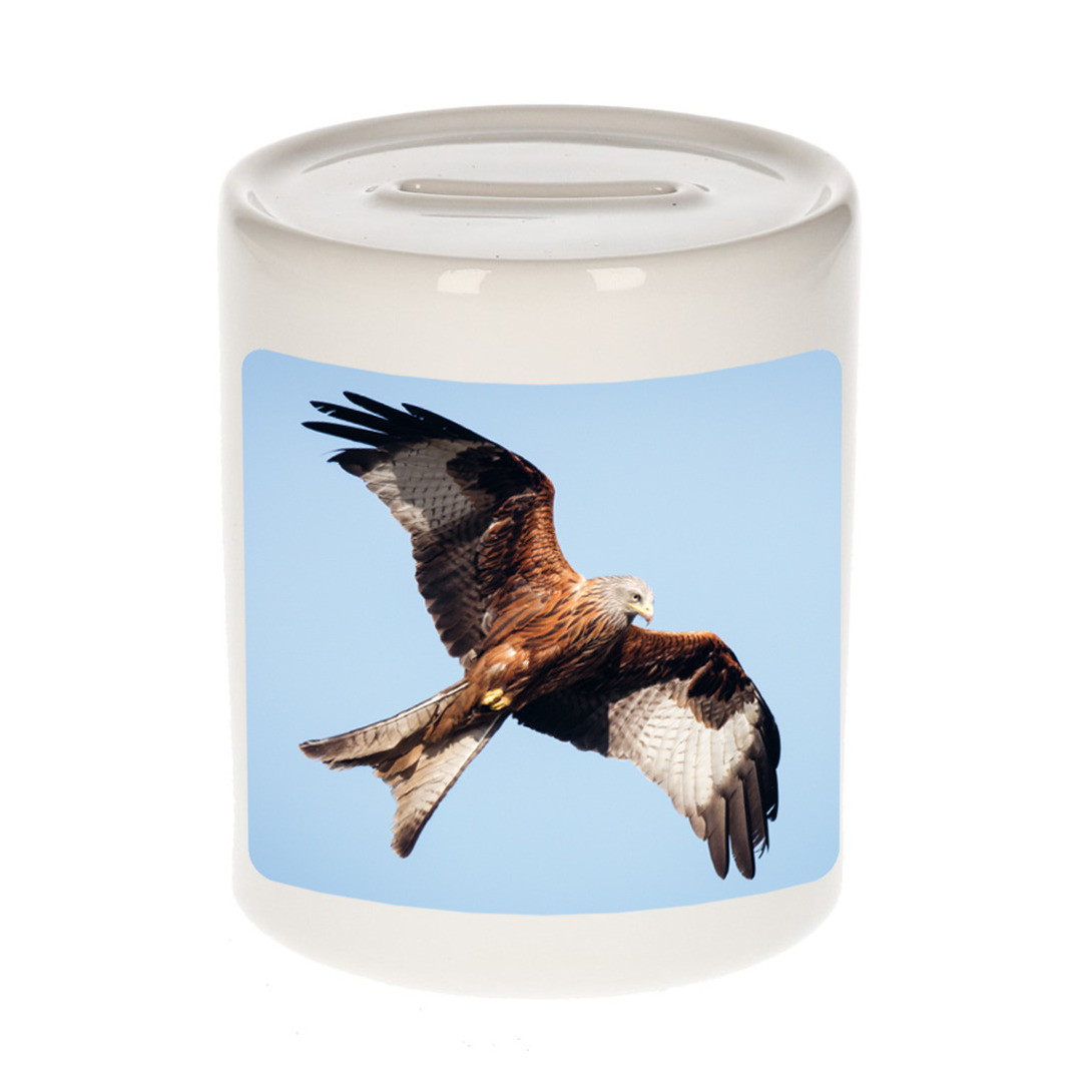 Dieren foto spaarpot rode wouw roofvogel wit 9 cm. Deze spaarpot is aan twee kanten bedrukt met een mooie rode wouw roofvogel foto. Een musthave voor een echte dieren/ vogels liefhebber of iemand die alles van vogels spaart. Erg leuk om cadeau te doen aan een echte vogels fan!