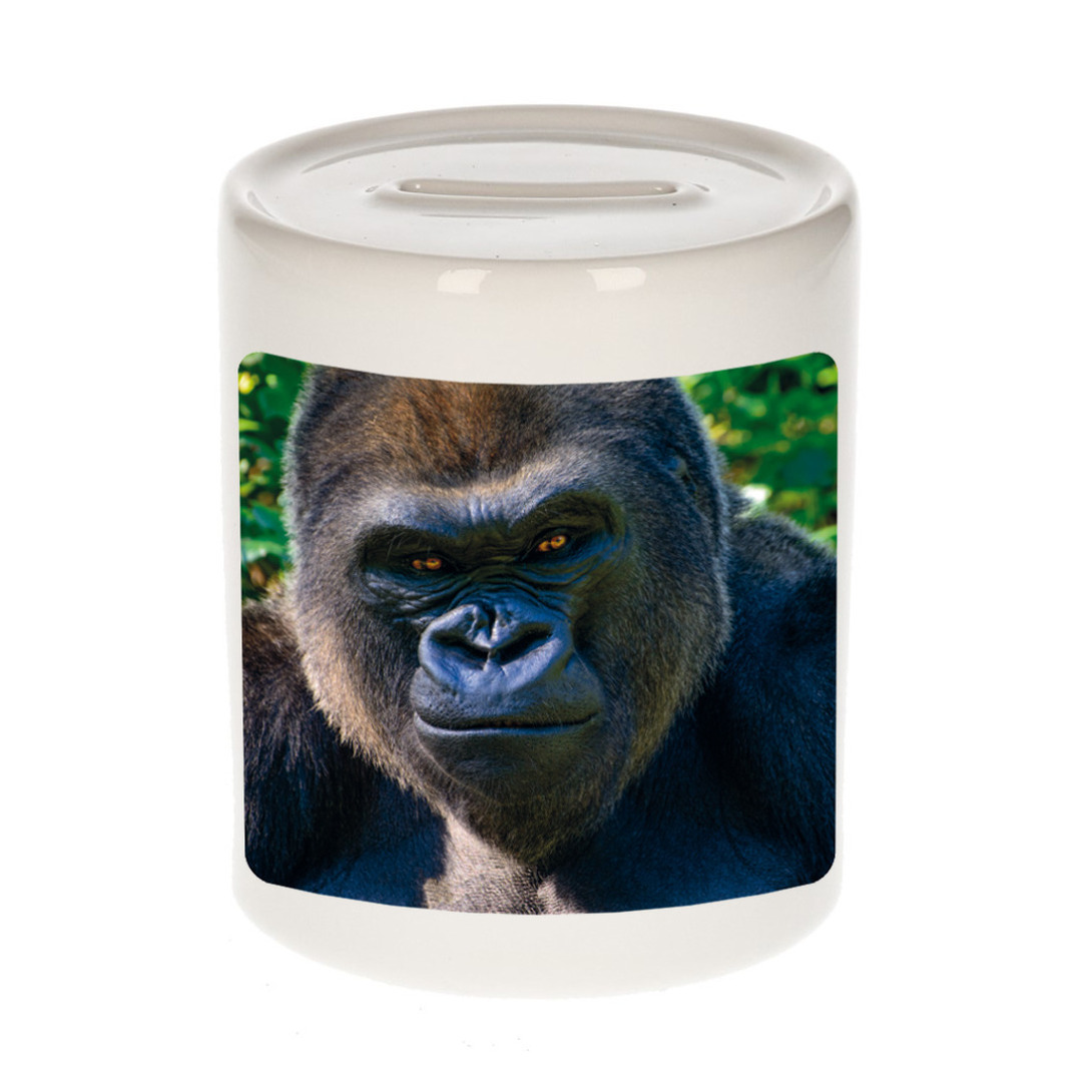Dieren foto spaarpot stoere gorilla wit 9 cm. Deze spaarpot is aan twee kanten bedrukt met een mooie stoere gorilla foto. Een musthave voor een echte dieren/ gorilla apen liefhebber of iemand die alles van gorilla apen spaart. Erg leuk om cadeau te doen aan een echte gorilla apen fan!
