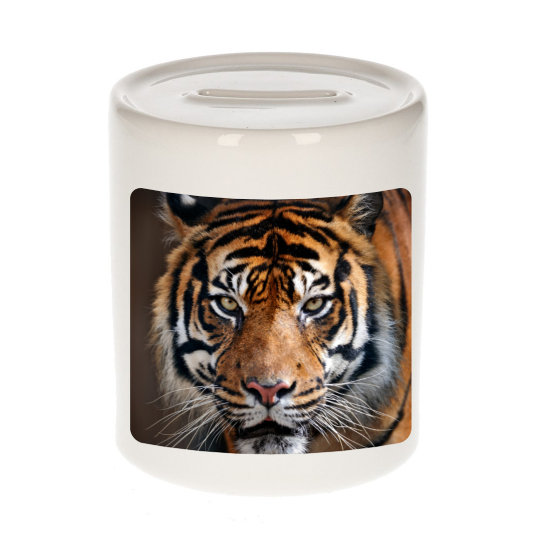 Dieren foto spaarpot tijger wit 9 cm. Deze spaarpot is aan twee kanten bedrukt met een mooie tijger foto. Een musthave voor een echte dieren/ tijgers liefhebber of iemand die alles van tijgers spaart. Erg leuk om cadeau te doen aan een echte tijger fan!