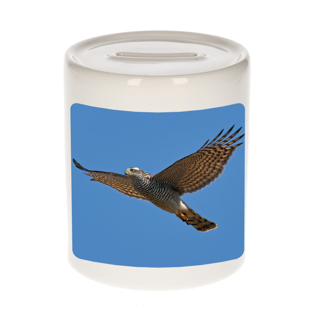 Dieren foto spaarpot vliegende havik roofvogel wit 9 cm. Deze spaarpot is aan twee kanten bedrukt met een mooie vliegende havik roofvogel foto. Een musthave voor een echte dieren/ vogels liefhebber of iemand die alles van vogels spaart. Erg leuk om cadeau te doen aan een echte vogels fan!