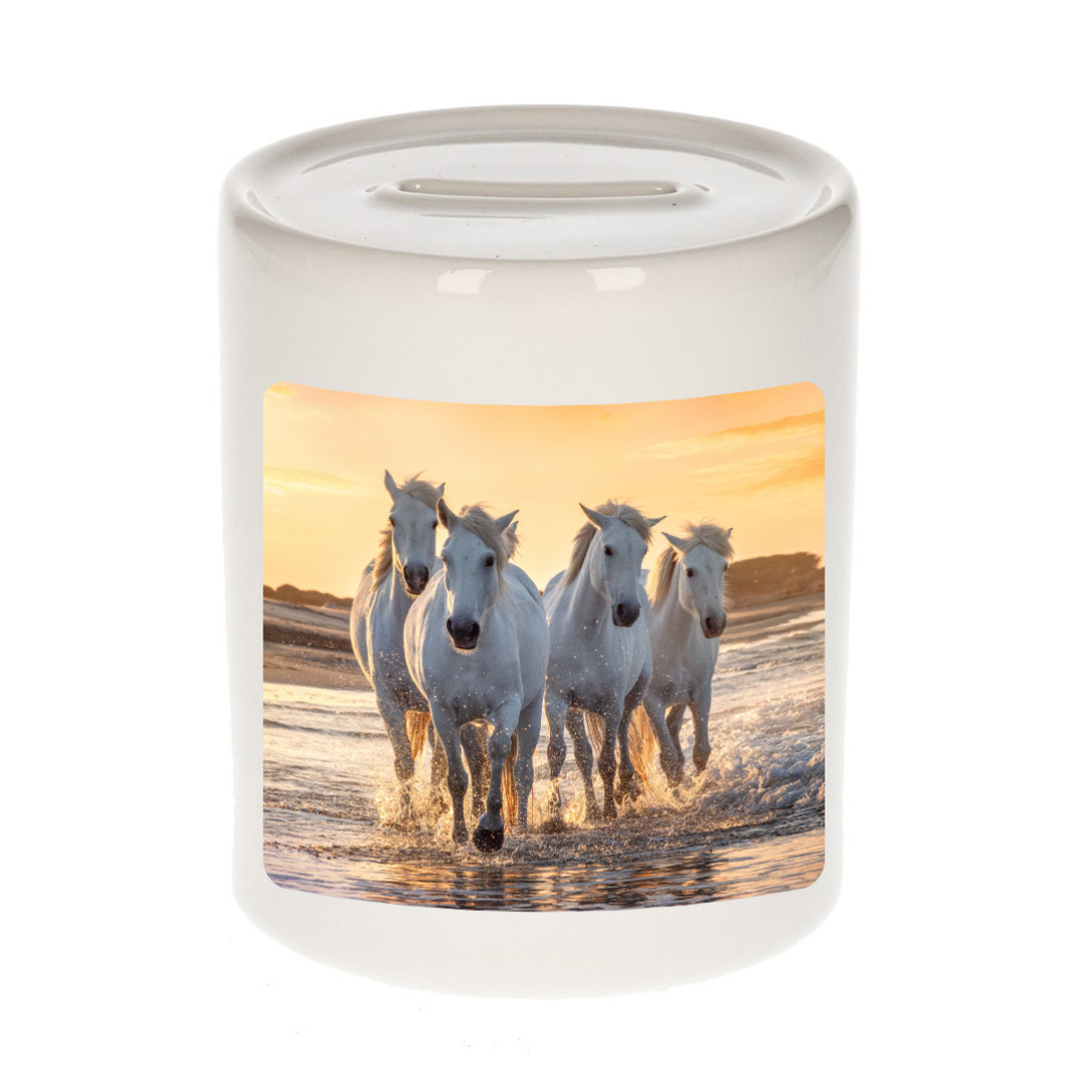 Dieren foto spaarpot wit paard wit 9 cm. Deze spaarpot is aan twee kanten bedrukt met een mooie witte paarden foto. Een musthave voor een echte dieren/ paarden liefhebber of iemand die alles van paarden spaart. Erg leuk om cadeau te doen aan een echte paarden fan!