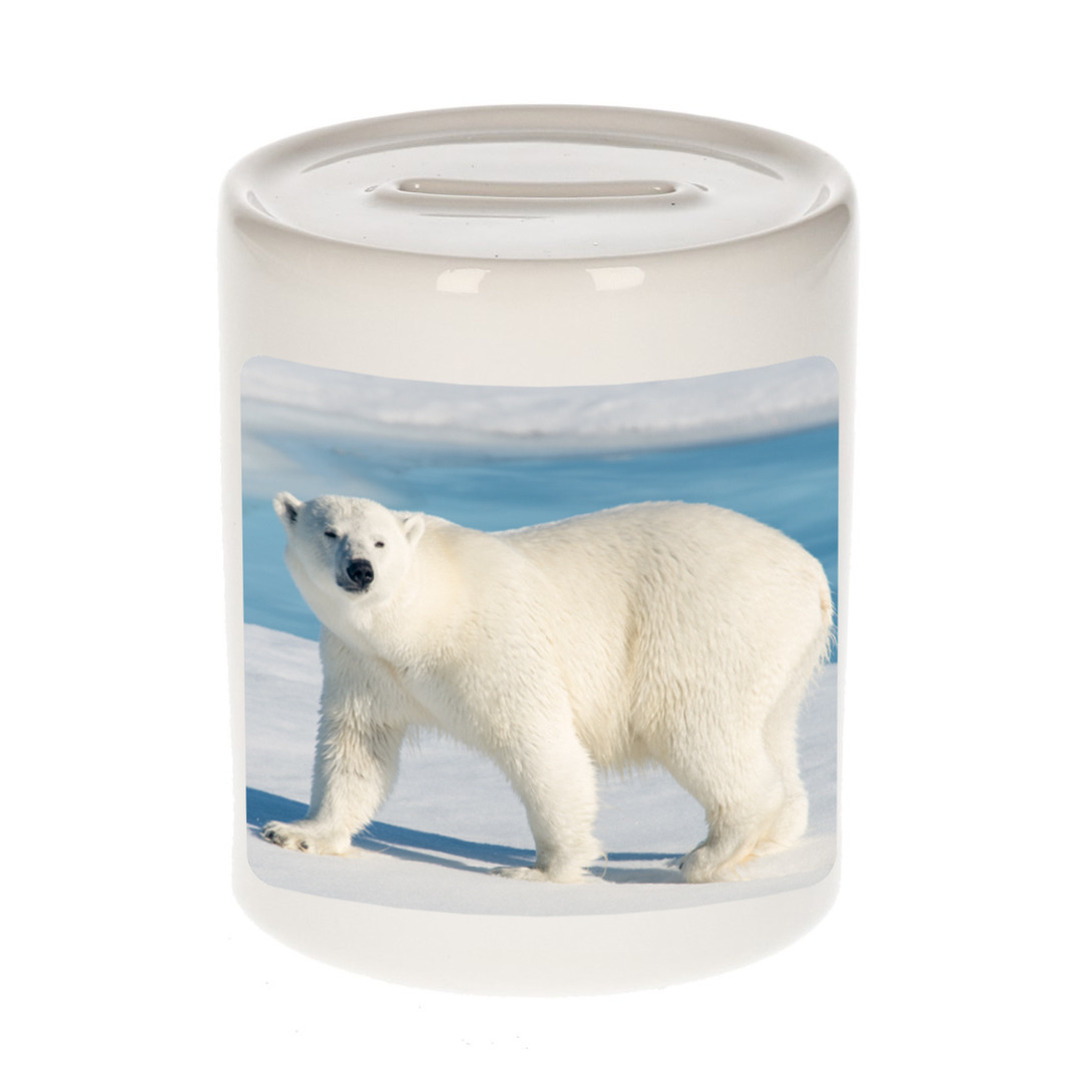 Dieren foto spaarpot witte ijsbeer wit 9 cm. Deze spaarpot is aan twee kanten bedrukt met een mooie witte ijsbeer foto. Een musthave voor een echte dieren/ ijsberen liefhebber of iemand die alles van ijsberen spaart. Erg leuk om cadeau te doen aan een echte ijsberen fan!