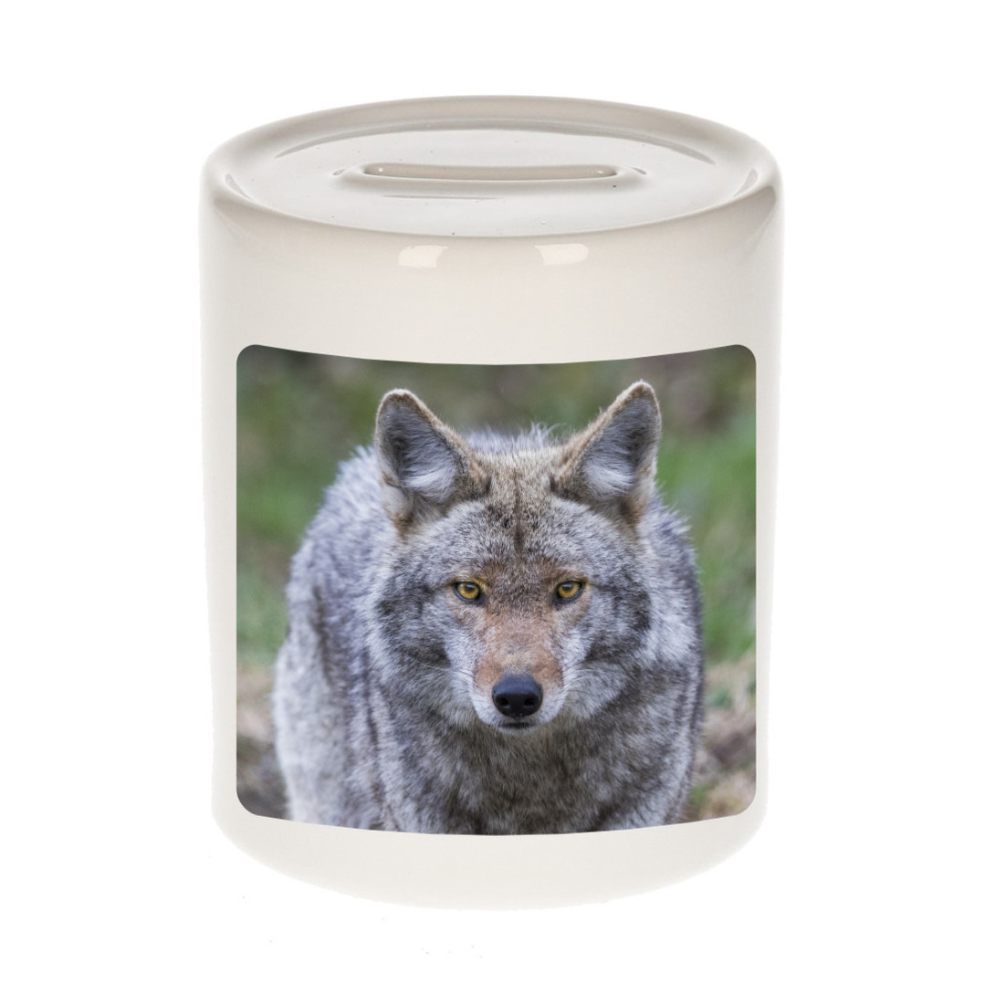 Dieren foto spaarpot wolf wit 9 cm. Deze spaarpot is aan twee kanten bedrukt met een mooie wolf foto. Een musthave voor een echte dieren/ wolven liefhebber of iemand die alles van wolven spaart. Erg leuk om cadeau te doen aan een echte wolven fan!