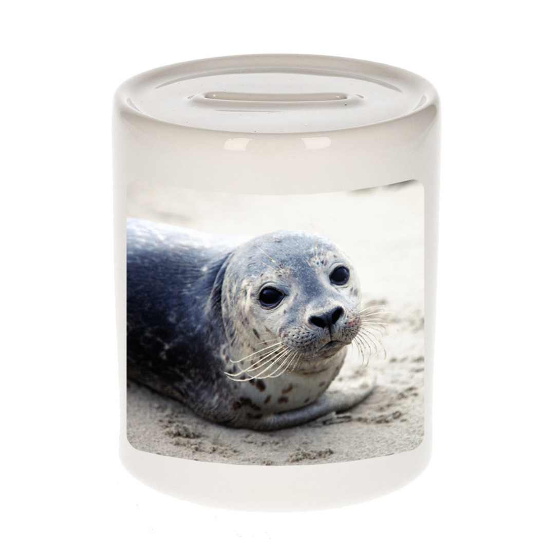 Dieren foto spaarpot zeehond wit 9 cm. Deze spaarpot is aan twee kanten bedrukt met een mooie zeehond foto. Een musthave voor een echte dieren/ zeehonden liefhebber of iemand die alles van zeehonden spaart. Erg leuk om cadeau te doen aan een echte zeehonden fan!