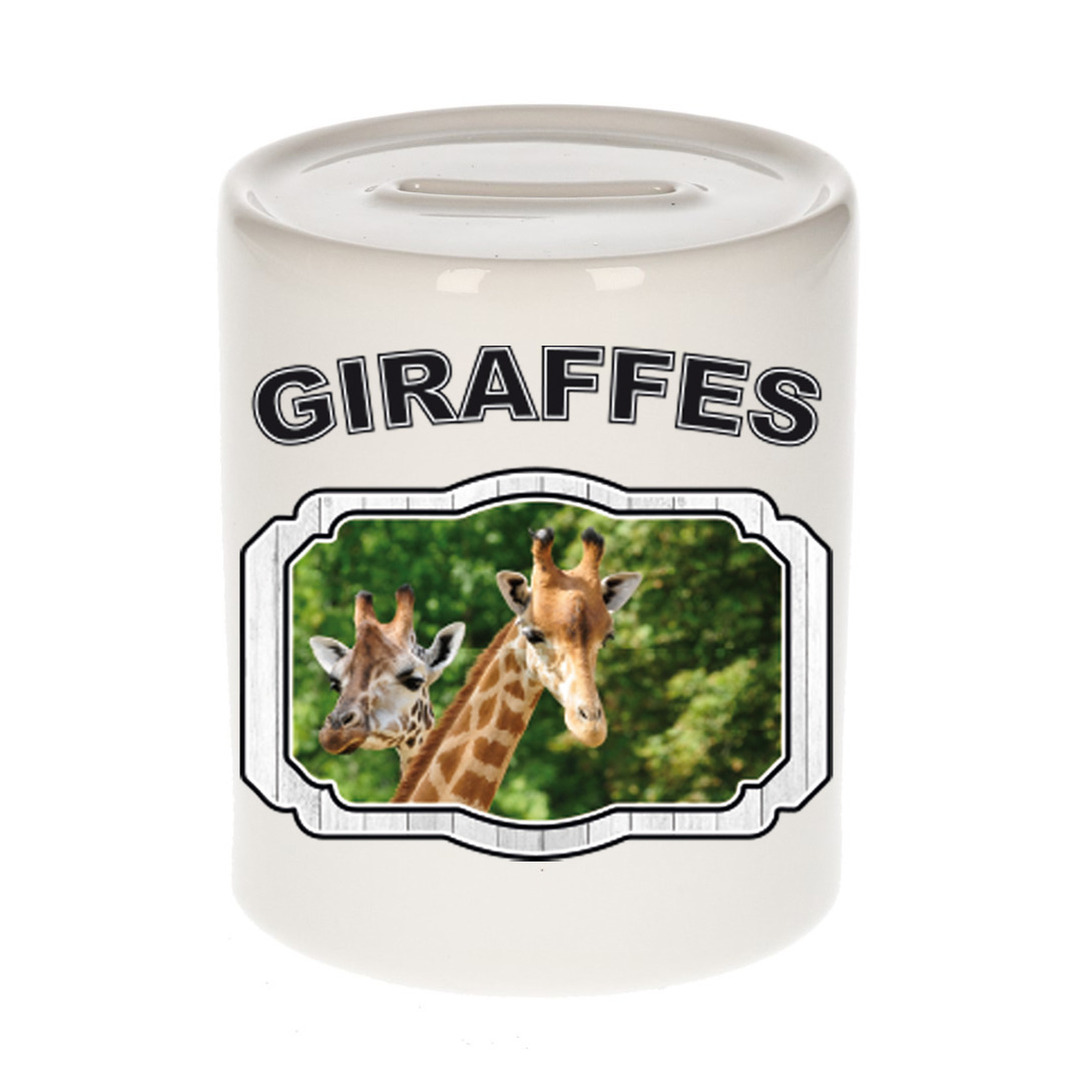 Dieren giraffe spaarpot – giraffes spaarpot jongens en meisjes 9 cm. Deze witte spaarpot is tweezijdig bedrukt met een giraffen afbeelding en de tekst: giraffes. Een musthave voor een echte dieren/ giraffen liefhebber of iemand die alles van giraffen spaart. Erg leuk om cadeau te doen aan een echte giraffen fan!