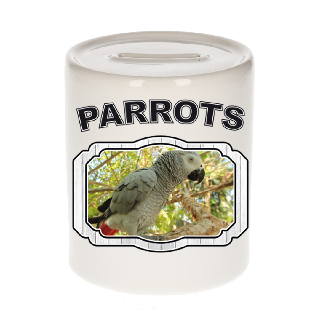 Dieren grijze roodstaart papegaai spaarpot – parrots spaarpot jongens en meisjes 9 cm. Deze witte spaarpot is tweezijdig bedrukt met een papegaaien afbeelding en de tekst: parrots. Een musthave voor een echte dieren/ papegaaien liefhebber of iemand die alles van papegaaien spaart. Erg leuk om cadeau te doen aan een echte papegaaien fan!