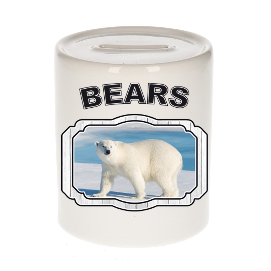 Dieren grote ijsbeer spaarpot – bears spaarpot jongens en meisjes 9 cm. Deze witte spaarpot is tweezijdig bedrukt met een ijsberen afbeelding en de tekst: bears. Een musthave voor een echte dieren/ ijsberen liefhebber of iemand die alles van ijsberen spaart. Erg leuk om cadeau te doen aan een echte ijsberen fan!