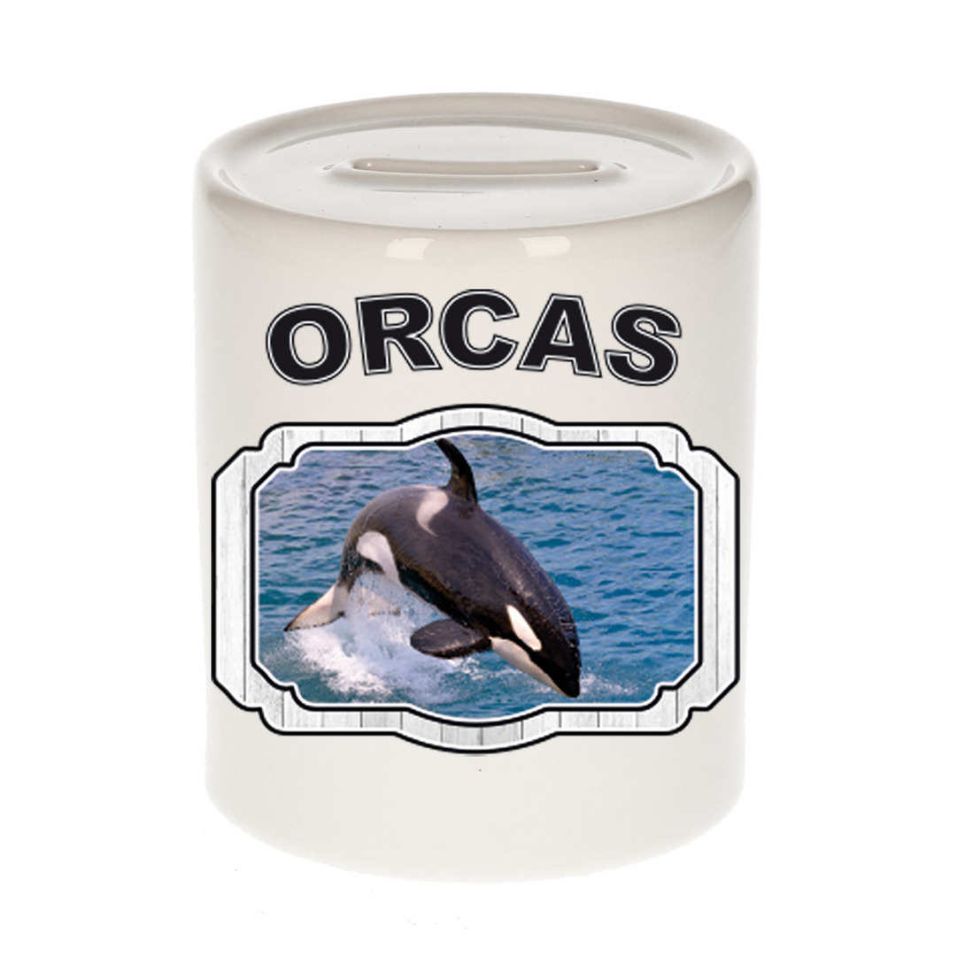 Dieren grote orka spaarpot – orcas spaarpot jongens en meisjes 9 cm. Deze witte spaarpot is tweezijdig bedrukt met een orka walvissen afbeelding en de tekst: orcas. Een musthave voor een echte dieren/ orka walvissen liefhebber of iemand die alles van orka walvissen spaart. Erg leuk om cadeau te doen aan een echte orka walvissen fan!