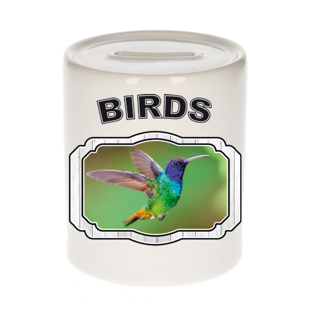 Dieren kolibrie vogel spaarpot – birds spaarpot jongens en meisjes 9 cm. Deze witte spaarpot is tweezijdig bedrukt met een vogels afbeelding en de tekst: birds. Een musthave voor een echte dieren/ vogels liefhebber of iemand die alles van vogels spaart. Erg leuk om cadeau te doen aan een echte vogels fan!