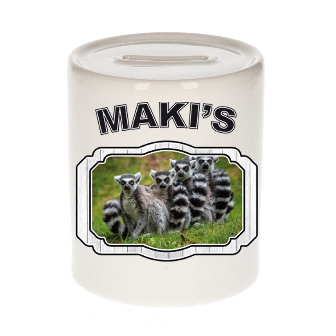 Dieren maki familie spaarpot – makis spaarpot jongens en meisjes 9 cm. Deze witte spaarpot is tweezijdig bedrukt met een maki apen afbeelding en de tekst: makis. Een musthave voor een echte dieren/ maki apen liefhebber of iemand die alles van maki apen spaart. Erg leuk om cadeau te doen aan een echte maki apen fan!