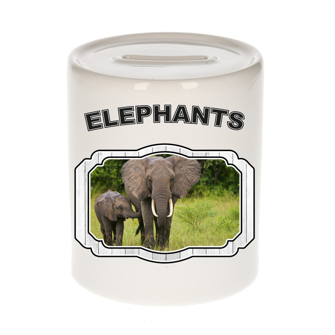 Dieren olifant spaarpot – elephants spaarpot jongens en meisjes 9 cm. Deze witte spaarpot is tweezijdig bedrukt met een olifanten afbeelding en de tekst: elephants. Een musthave voor een echte dieren/ olifanten liefhebber of iemand die alles van olifanten spaart. Erg leuk om cadeau te doen aan een echte olifanten fan!