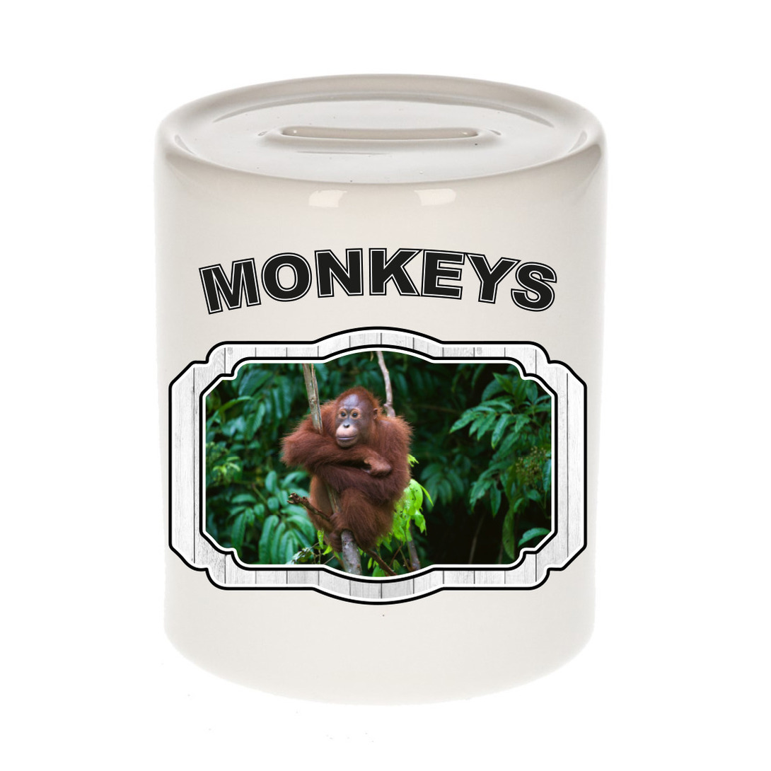Dieren orangoetan spaarpot – monkeys spaarpot jongens en meisjes 9 cm. Deze witte spaarpot is tweezijdig bedrukt met een apen afbeelding en de tekst: monkeys. Een musthave voor een echte dieren/ apen liefhebber of iemand die alles van apen spaart. Erg leuk om cadeau te doen aan een echte apen fan!