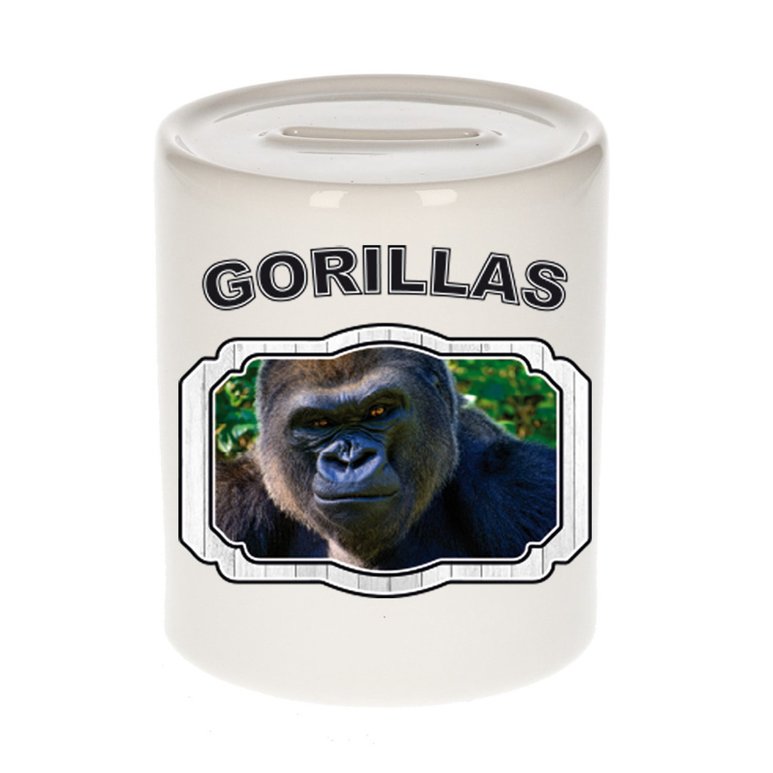 Dieren stoere gorilla spaarpot – gorillas spaarpot jongens en meisjes 9 cm. Deze witte spaarpot is tweezijdig bedrukt met een gorilla apen afbeelding en de tekst: gorillas. Een musthave voor een echte dieren/ gorilla apen liefhebber of iemand die alles van gorilla apen spaart. Erg leuk om cadeau te doen aan een echte gorilla apen fan!