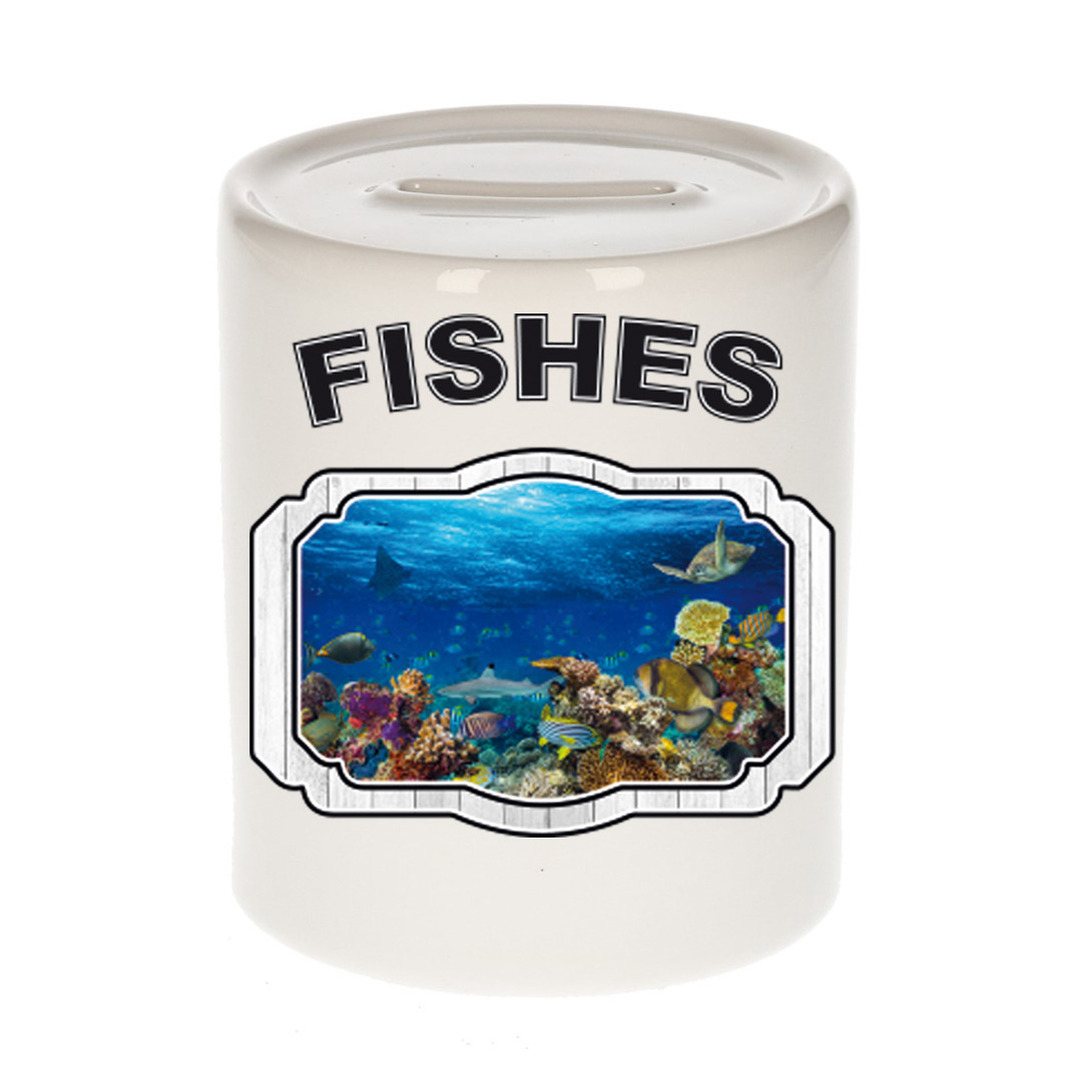 Dieren vis spaarpot – fishes spaarpot jongens en meisjes 9 cm. Deze witte spaarpot is tweezijdig bedrukt met een vissen afbeelding en de tekst: fishes. Een musthave voor een echte dieren/ vissen liefhebber of iemand die alles van vissen spaart. Erg leuk om cadeau te doen aan een echte vissen fan!