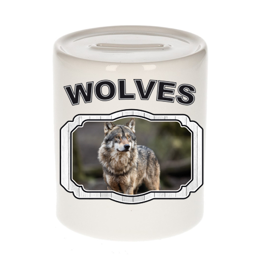 Dieren wolf spaarpot – wolves spaarpot jongens en meisjes 9 cm. Deze witte spaarpot is tweezijdig bedrukt met een wolven afbeelding en de tekst: wolves. Een musthave voor een echte dieren/ wolven liefhebber of iemand die alles van wolven spaart. Erg leuk om cadeau te doen aan een echte wolven fan!
