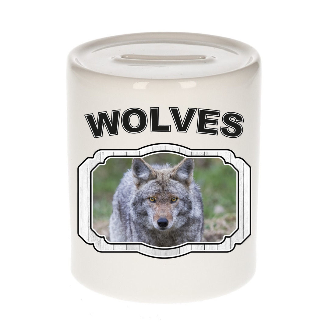 Dieren wolf spaarpot – wolves spaarpot jongens en meisjes 9 cm. Deze witte spaarpot is tweezijdig bedrukt met een wolven afbeelding en de tekst: wolves. Een musthave voor een echte dieren/ wolven liefhebber of iemand die alles van wolven spaart. Erg leuk om cadeau te doen aan een echte wolven fan!