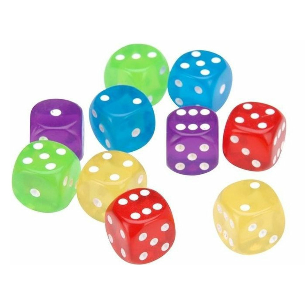 10x Dobbelstenen in een kleurenmix van de kleuren geel, blauw, rood, groen en blauw. Een set dobbelstenen die kleurrijk en uniek zijn dankzij de verschillende kleuren is het nu nog leuker om bordspellen of dobbelspellen te spelen of andere activiteiten te doen. Materiaal: kunststof. Afmeting per dobbelsteen: 1,5 x 1,5 cm.
