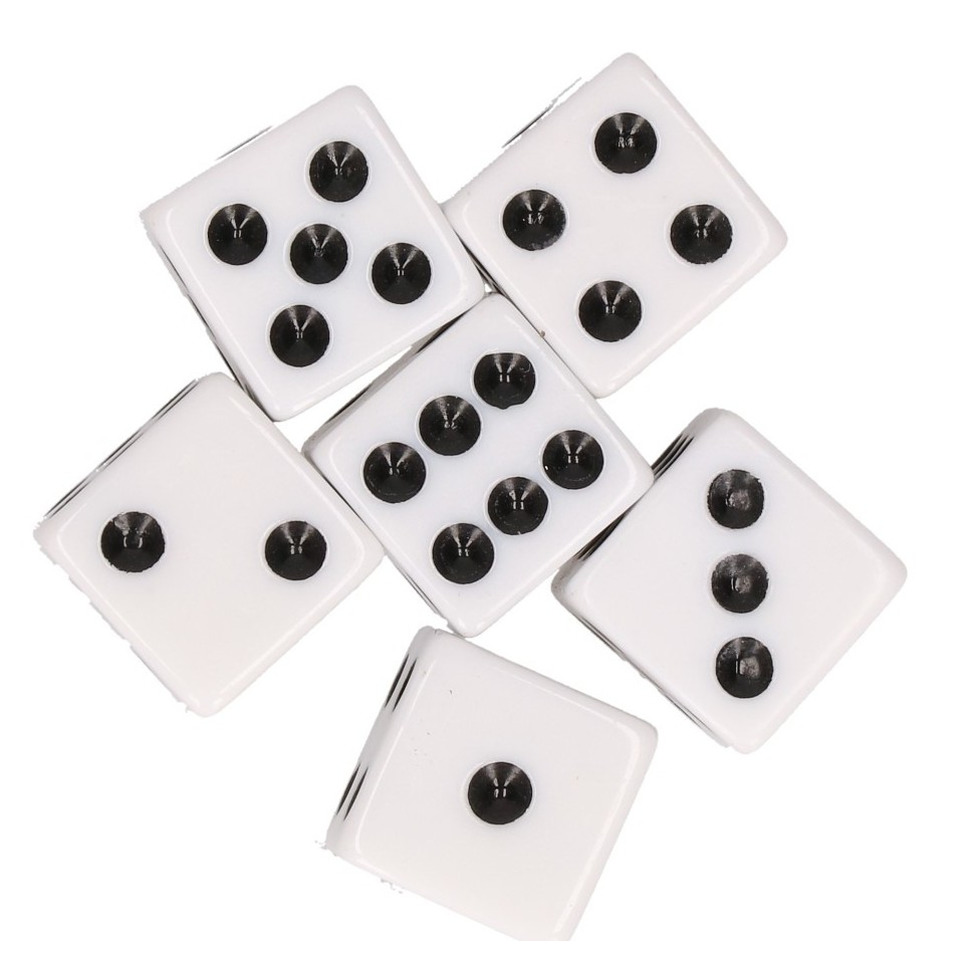 Setje van 24 losse dobbelstenen op blisterkaart.