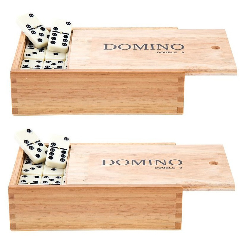 Domino spel dubbel/double 9 in houten doos 110x stenen. Dominostenen met spinners in houten bewaardoos.