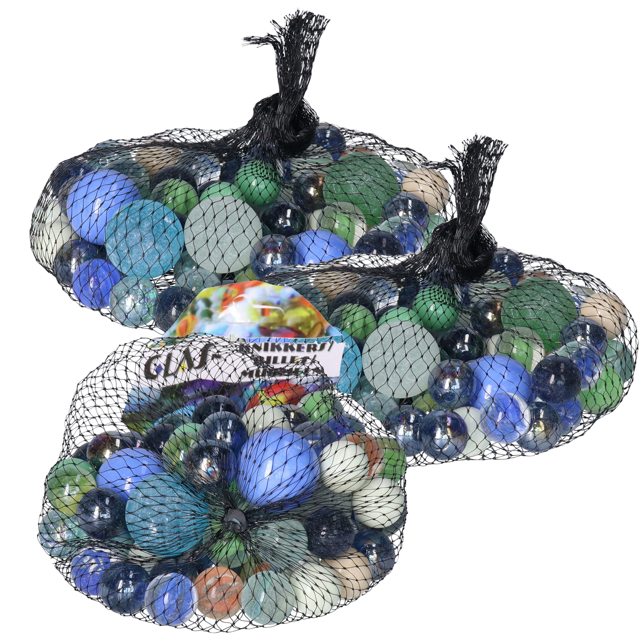 237x Gekleurde glazen knikkers in een netje. Netje gekleurde en transparante knikkers 500 gram. Inhoud: 74 kleine knikkers en 5 grotere knikkers. Materiaal: glas.