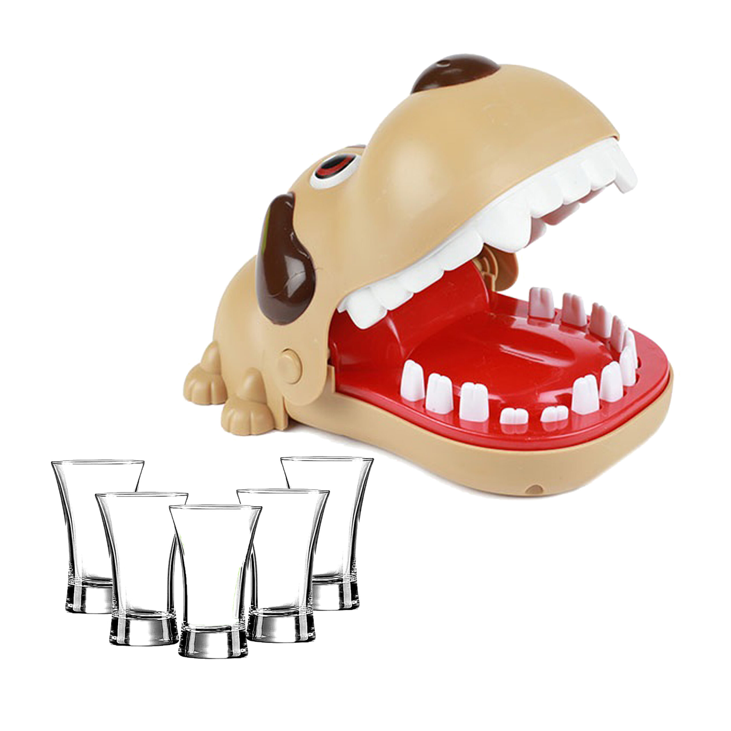 De Bijtende Hond met shotglazen. De nieuwe versie van de bijtende krokodil, maar net zo leuk! Het spannende reactie vermogen spel voor een gezellige avond! Een avondje met je vrienden in de planning en opzoek naar een leuk drankspel? Speel dan met de bijtende hond een shotjesspel! De verliezer neemt een shotje. Uren lang vermaakt met de bijtende hond. Formaat: L10,5 x B16,5 x H8,5 cm. Inhoud: 1x het spel de bijtende hond en 6x shotglazen.