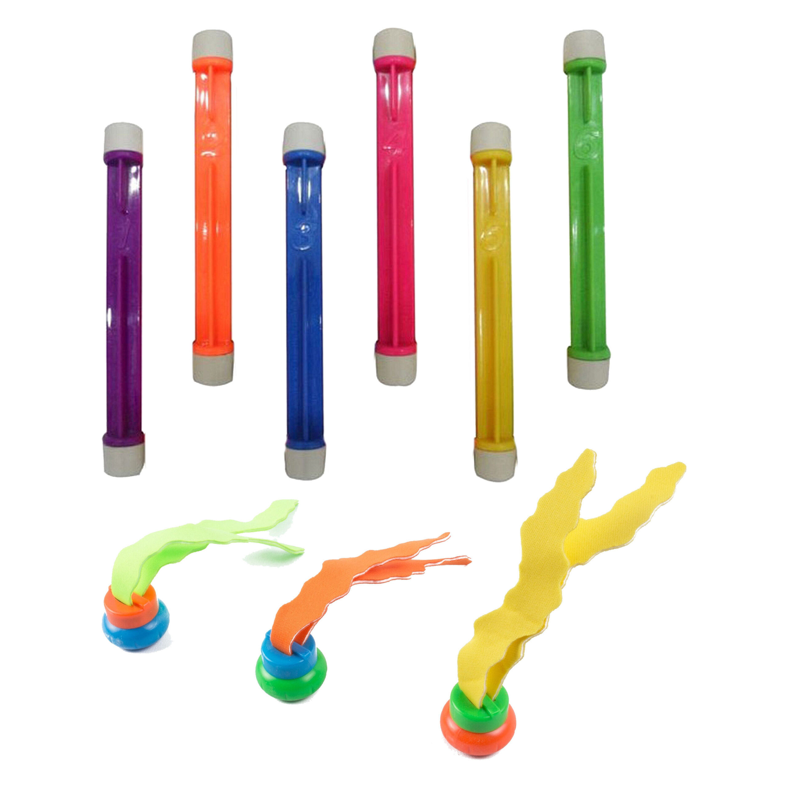Duikspeelgoed set van 9 stuks. De set bestaat uit 6 stuks duikstaven en 3 stuks zeewier in felle kleuren. Gooi de duik staven en zeewier in het water en ze zinken naar de bodem van het zwembad, zodat je ze weer kan opduiken. Het zeewier heeft een leuk effect als het naar beneden zinkt en op de bodem dansen de sliertjes in het water. Leuk spel voor bijvoorbeeld op vakantie. Materiaal: Kunststof.