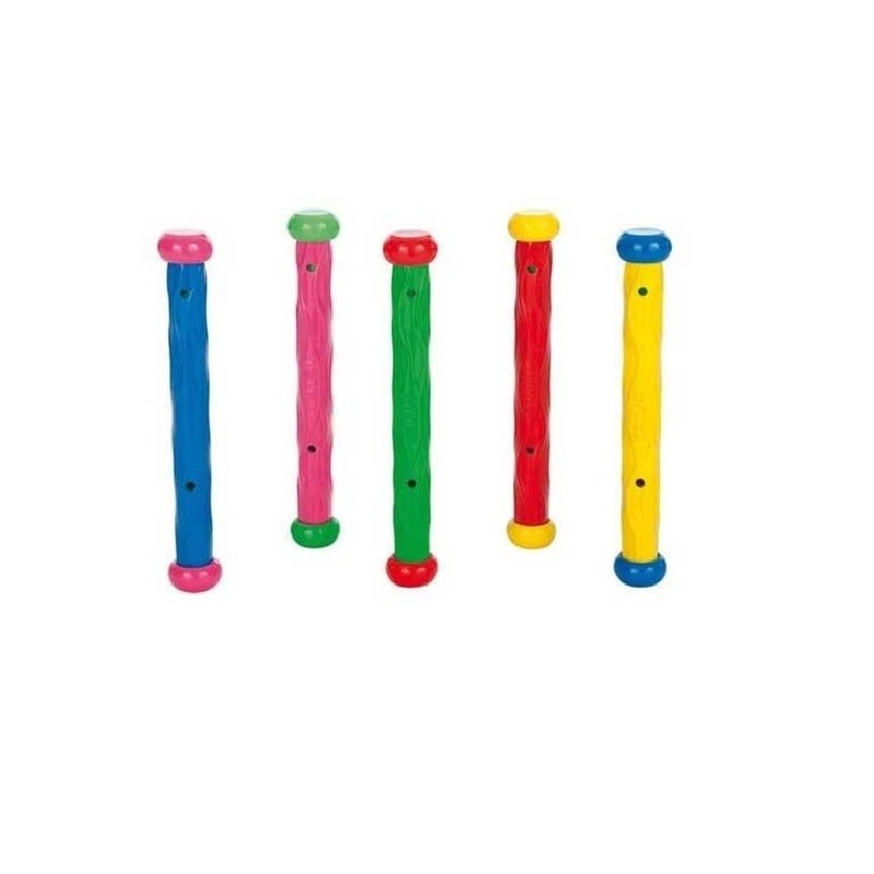 5x gekleurde duikstokjes van kunststof. Deze gekleurde duikstokjes zijn het ultieme duikspeelgoed. Deze stokjes zinken in het water naar de boden en zullen op de bodem recht blijven staan. Inhoud: 5x stuks.