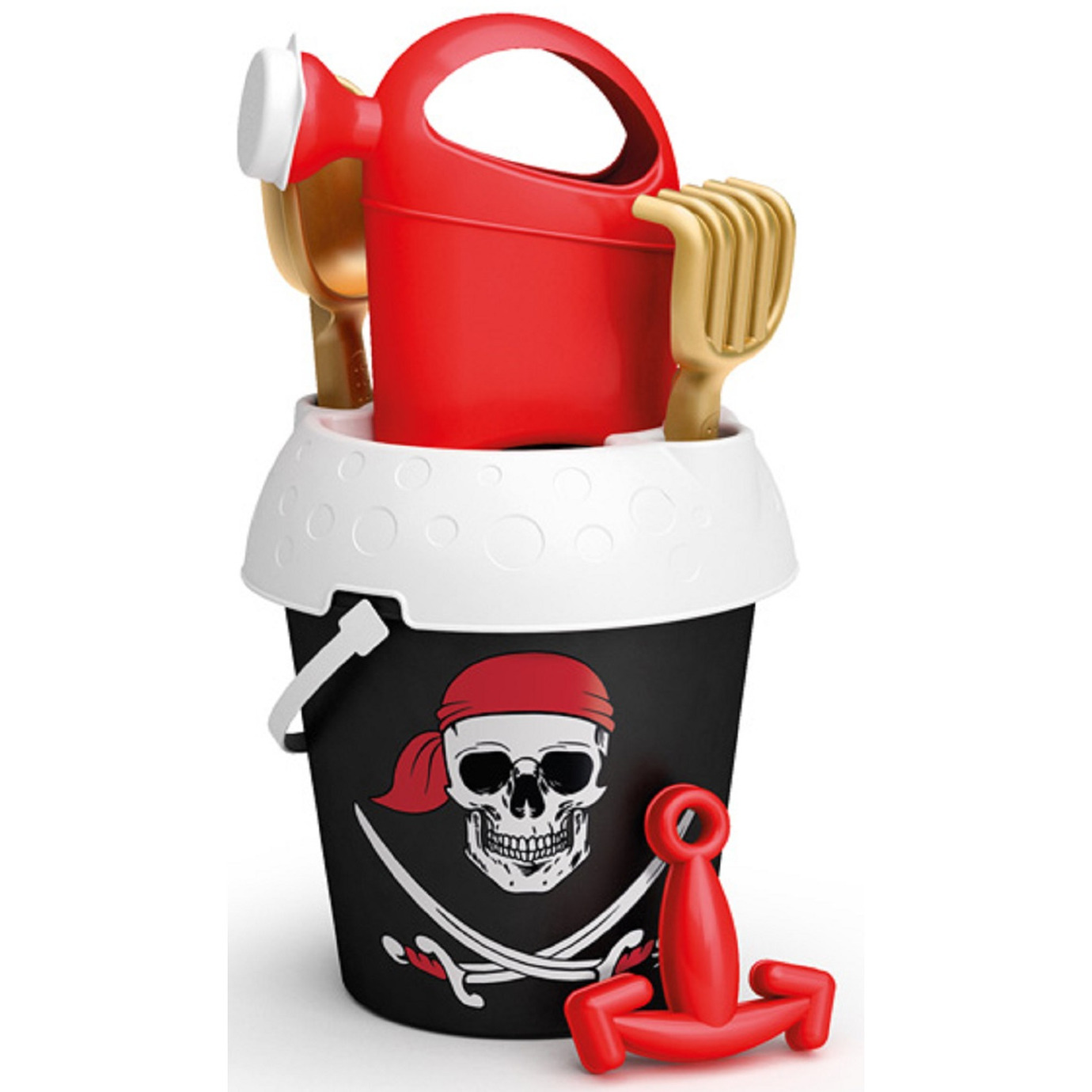 5-Delig Emmersetje met piraat thema. Dit setje bestaat uit 1x emmer, 1x schepje, 1x harkje 1x gieter en 1x zandvormpje. De emmer heeft een afmeting van circa 17 cm hoog en 17 cm breed en is gemaakt van kunststof.