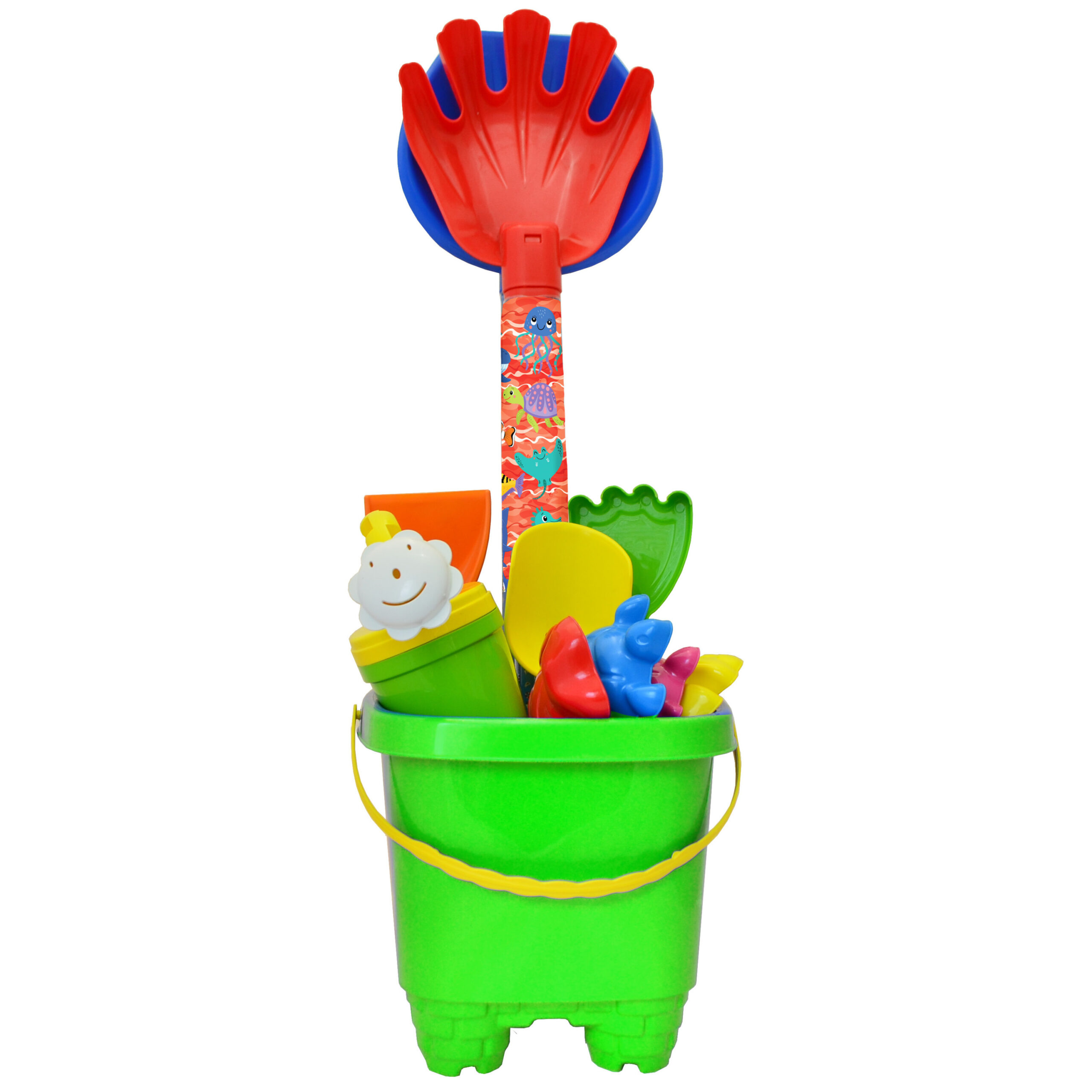 11-Delig emmersetje in de kleur groen. De emmer heeft een afmeting van circa 20 cm hoog, een breedte van circa 19 cm en is door de vorm ideaal om zandkastelen mee te bouwen. De gehele set is gemaakt van kunsstof.