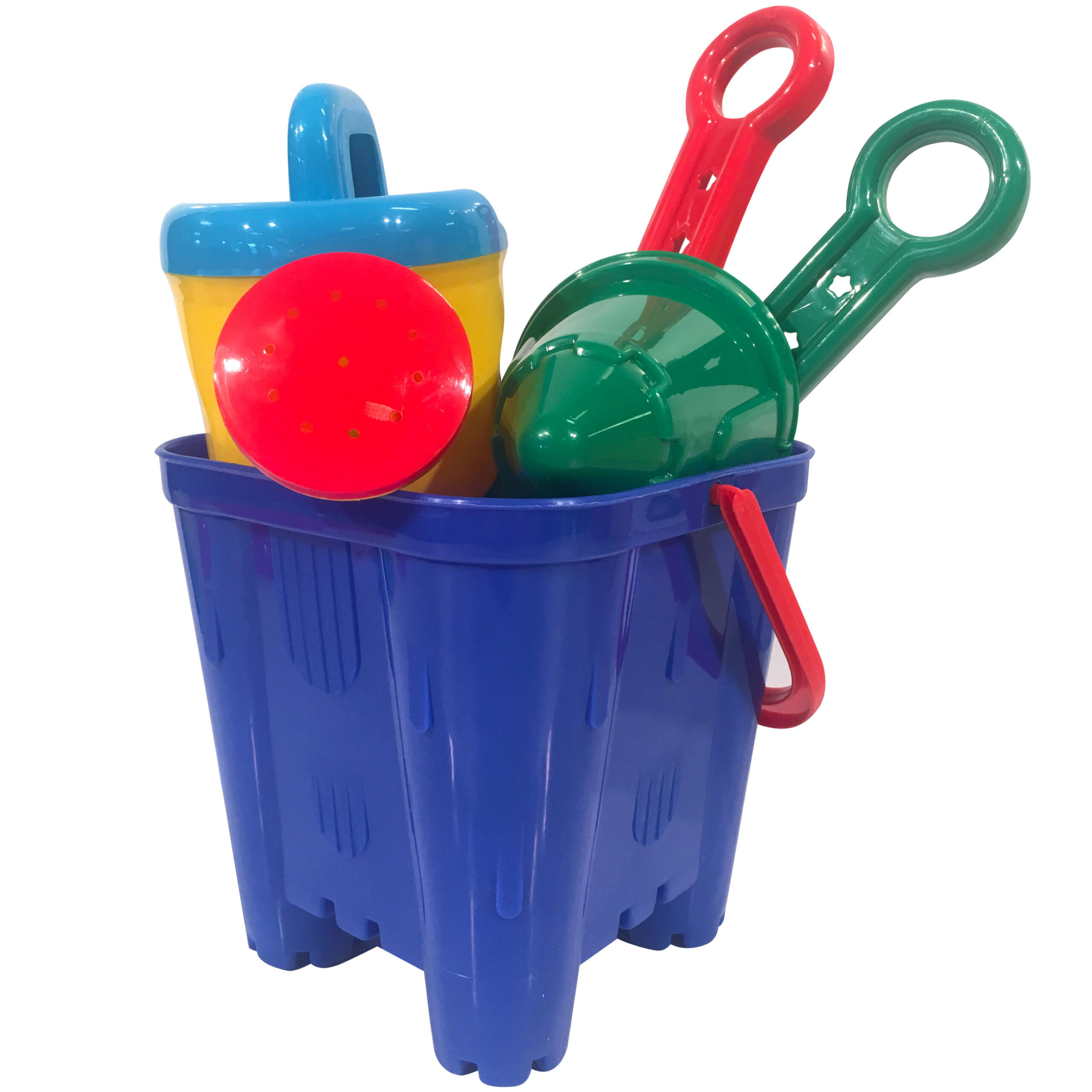 4-Delig emmersetje in de kleur blauw. De emmer heeft een afmeting van circa 15 cm hoog, een breedte van circa 15 cm en is door de vorm ideaal om zandkastelen mee te bouwen. De gehele set is gemaakt van kunststof.