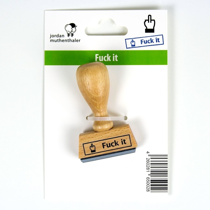 Een stempel met daarop de tekst Fuck It en een middelvinger. De stempel is gemaakt van hout en heeft een totale afmeting van ca. 4 x 2 x 6,5 cm. De afmeting van het stempelgedeelte is ca. 3,5 x 0,9 cm. Exclusief inkt.