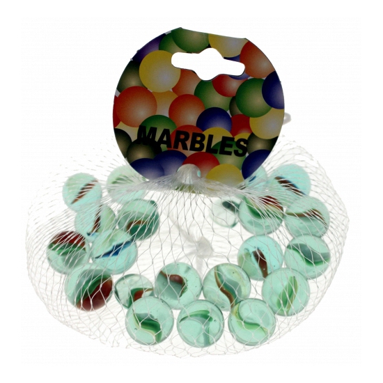 Glazen gekleurde knikkers. Dit netje bevat 20 glazen knikkers met een formaat van ongeveer 16 mm en 1 glazen knikker met een formaat van ongeveer 25 cm.