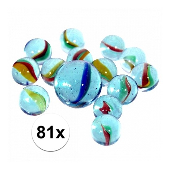 Glazen speelgoed knikkers 81x stuks. Een halve kilo knikkers waarvan er 80 een diameter van 16 mm hebben en 1 marmeren knikker met een diameter van 25 mm. Knikkeren voor kinderen.