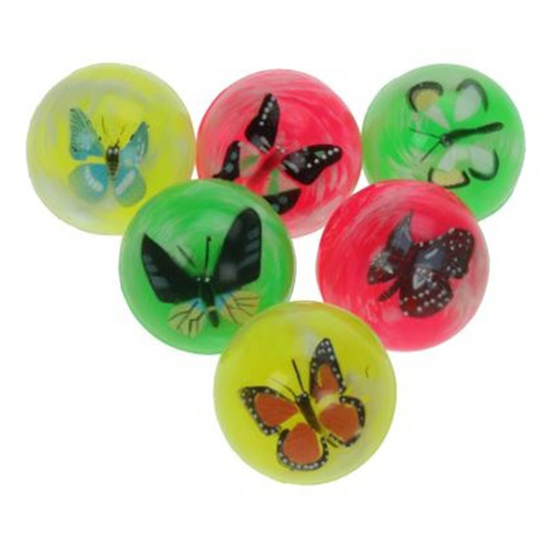 Grote stuiterballen met vlinder erin. Gekleurde stuiterbal met vlinder in het midden. Formaat: ongeveer 4,5 cm. U krijgt een willekeurige kleur toegestuurd. Kinder uitdeel speelgoed en dieren cadeau artikelen.