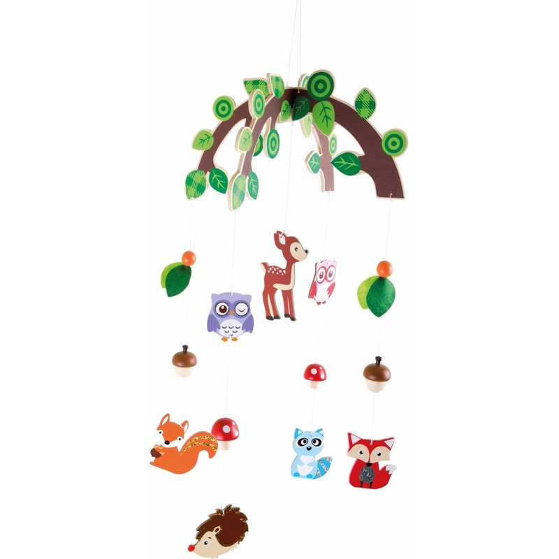 Hangdecoratie mobiel bosdieren voor jongens. Het formaat van deze bosdieren hangmobiel is ongeveer 66 x 29 x 29 cm.