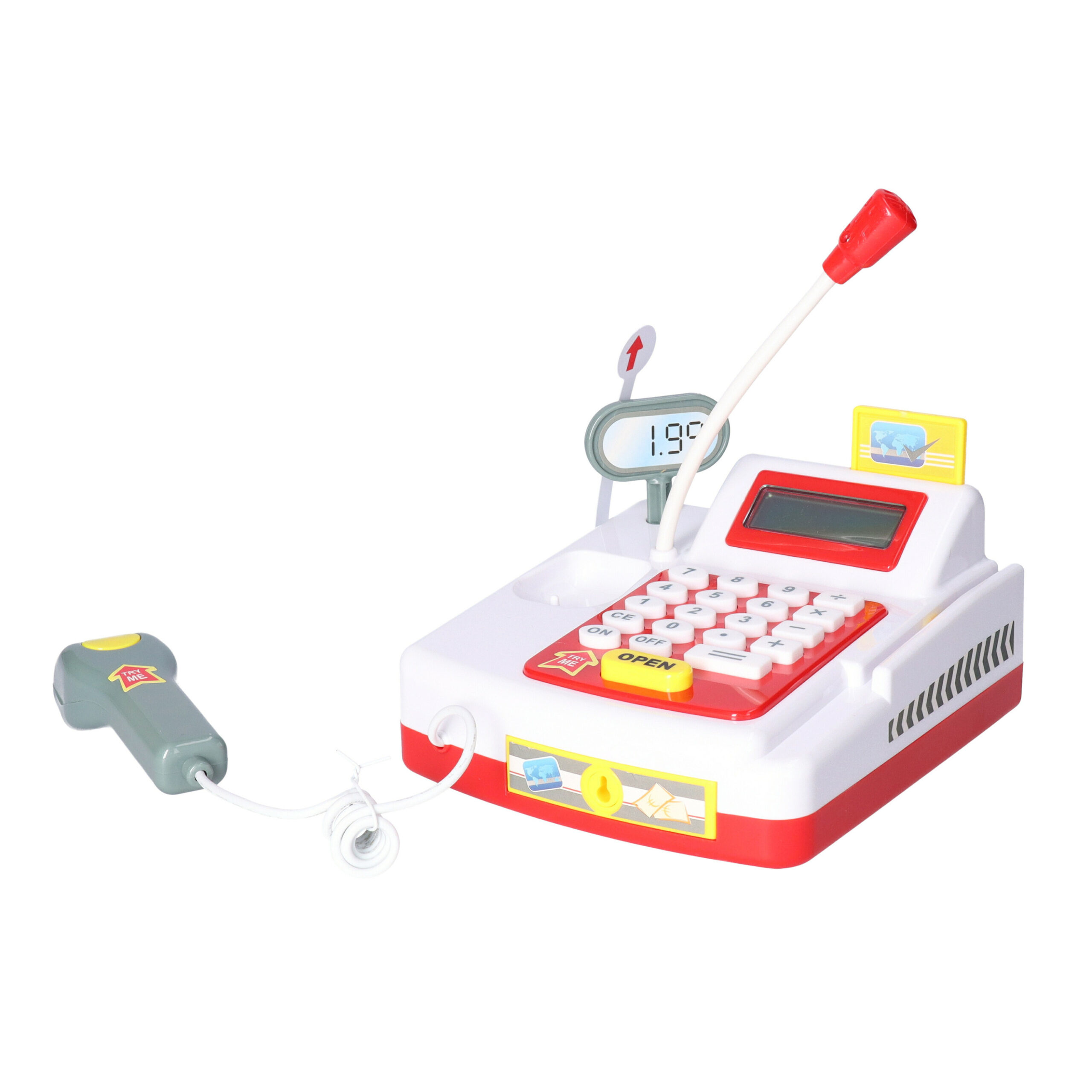 Speelgoed kassa met rekenmachine 9 x 9 x 7 cm voor kinderen. Complete kassalade speelset met licht en geluid, bestaande uit een kassa met scanner, lade (leeg), sleutel voor de kassalade, een bankpasje en een microfoon. In de microfoon kan iemand omgeroepen worden en op de rekenmachine kan het totaalbedrag van de gekochte boodschappen berekend worden. Spelenderwijs rekenen leren/oefenen.