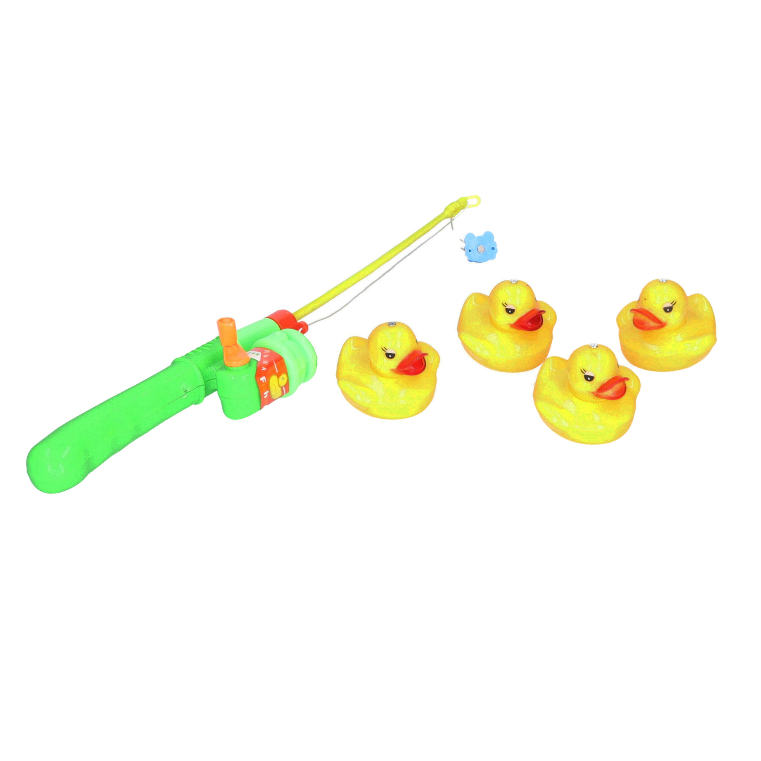 Hengelspel/eendjes vangen spel voor kinderen in de kleur groen/geel. Het leukste kermis spel voor kinderen om thuis te spelen. Net als op de kermis probeer je alle eendjes uit een bak water te vissen. Het spel is ook leuk om mee te spelen in bad, buiten in de vijver of in het zwembad. De set bestaat uit 1 hengel en 4 eendjes. Materiaal: kunststof. Pakket grootte: L17 x H43,5 cm.