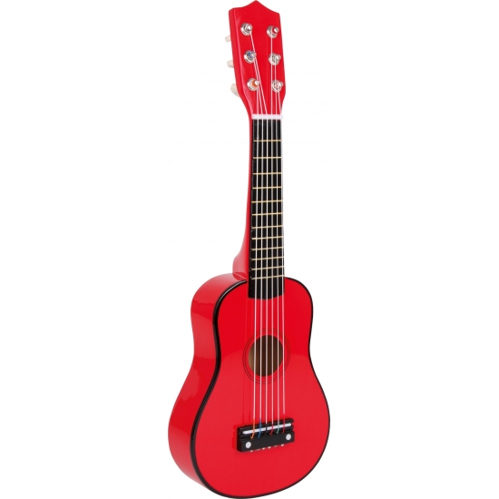 Speelgoed gitaar. Deze houten rode speelgoed gitaar met 6 kunststof snaren heeft een formaat van ongeveer 53 x 17 x 5,5 cm en is geschikt voor kinderen vanaf 3 jaar. Speelgoed muziek instrumenten.