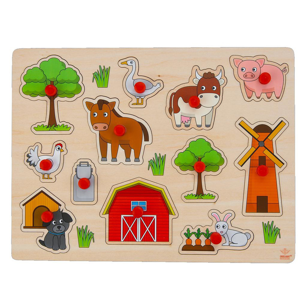 Houten knopjes/noppen puzzel boerderij thema 30 x 22 cm. Deze houten puzzel met knopjes aan de bovenzijde bestaat uit 12 stukjes. Op de stukjes staan onder andere een schuur, hond, paard, eend, koe, molen en een varken. Voor kinderen een prachtige uitdaging om de houten stukjes op de goede plek te krijgen. Daarnaast stimuleert de puzzel de fijne motoriek en de oog-hand coordinatie.