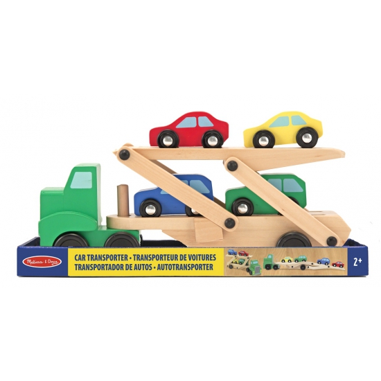 Houten auto transportwagen. Deze coole truck heeft een grote klus: het leveren van vier kleurrijke auto’s naar hun nieuwe eigenaren. Het bovenste niveau kan verlaagt worden zodat de autos er heel gemakkelijk op kunnen rijden. Zodra de autos op de truck staan kan het bovenste niveau weer omhoog geplaatst worden en is hij klaar om te vertrekken! Eer worden vier auto’s bijgeleverd in de kleuren blauw, groen, geel en rood.