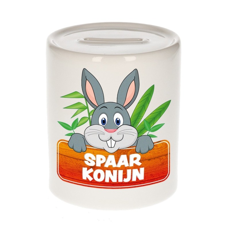 Kinder spaarpot met konijn print, 9 cm. Deze leuke dieren spaarpot is bedrukt met Bunny de spaar konijn.