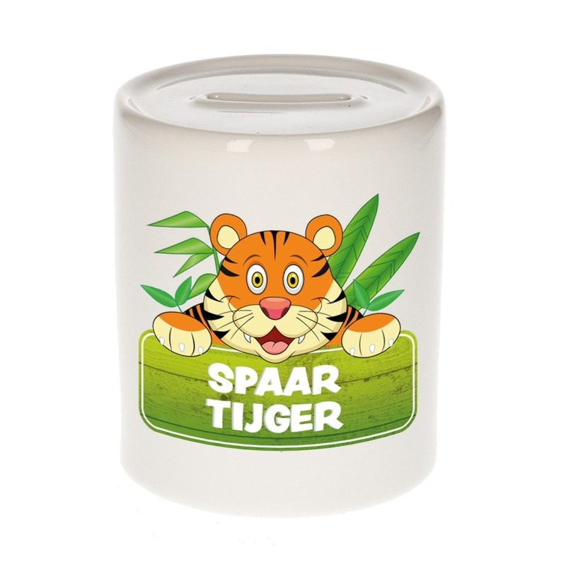 Kinder spaarpot met tijgers print, 9 cm. Deze leuke dieren spaarpot is bedrukt met Tony de spaar tijger.