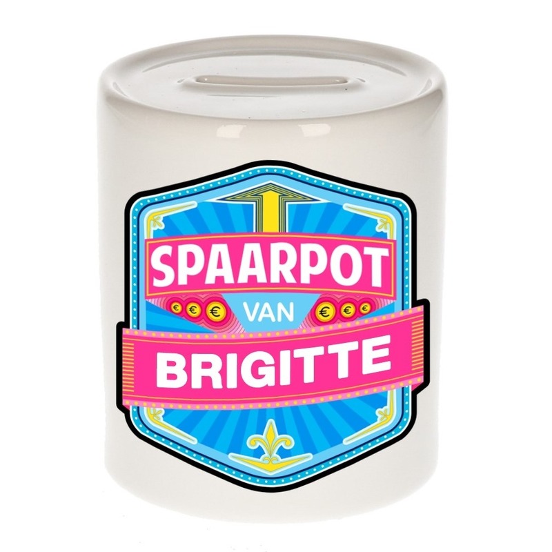 Kinder spaarpot voor Brigitte. Leuke kinder spaarpot met een vrolijk gekleurde opdruk. Deze kinder spaarpot voor Brigitte is gemaakt van keramiek en heeft een diameter van 8 cm en een hoogte van 9 cm.