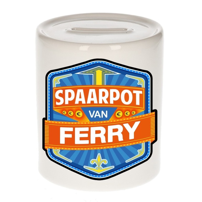 Kinder spaarpot voor Ferry. Leuke kinder spaarpot met een vrolijk gekleurde opdruk. Deze kinder spaarpot voor Ferry is gemaakt van keramiek en heeft een diameter van 8 cm en een hoogte van 9 cm.