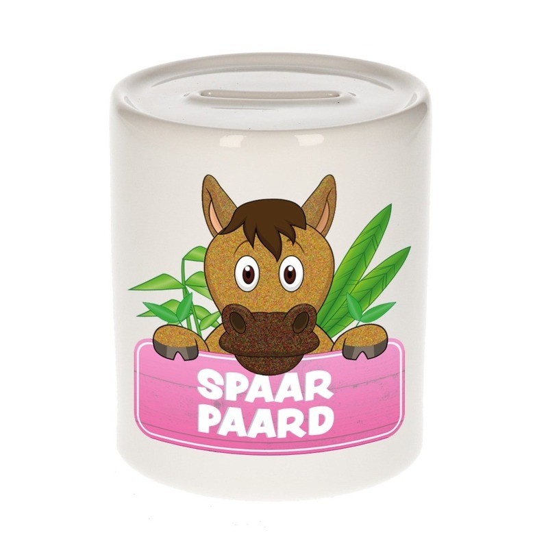 Kinder spaarpot met paarden print, 9 cm. Deze leuke dieren spaarpot is bedrukt met Jumping Jack de spaar paard. Paarden thema feestartikelen en spaarpotten.