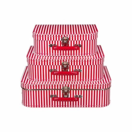 Klassiek model mini speelgoedkoffertje in rood met witte strepen. Het koffertje is gemaakt van stevig karton met een metalen sluiting en handvat. Formaat: ongeveer 18 x 25 x 9 cm.