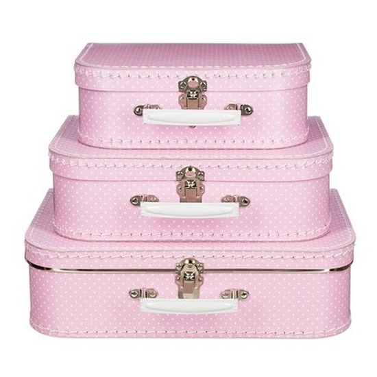 Teken kinderkoffertje roze met stippen 25 cm. Klassiek model koffertje voor kinderen. Materiaal: stevig karton. Formaat: ongeveer 25 x 18 cm. Ideaal koffertje voor het opbergen van potloden, stiften, kleurboeken en schetsboeken.